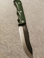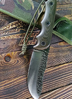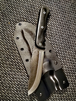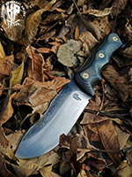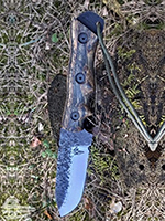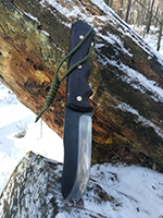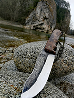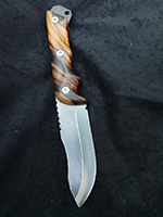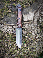 BUSHCRAFT - Zajmuję się tą formą rekreacji bardzo amatorsko, ale robiąc noże postanowiłem stworzyć nóż BUSHCRAFT lub SURVIVAL, który ma następujące cechy: jest wystarczająco duży i jednocześnie poręczny, można go trzymać w dłoni i swobodnie nim pracować np. na gałęziach, walory estetyczne dominowały po stronie funkcjonalistów i funkcjonalności. Ostrze musiało być wygięte tak, aby palec się nie ślizgał, a na przodzie ostrza znajduje się wgłębienie, w które możemy uderzyć np. w grubą gałąź, aby łatwiej było przeciąć jakiś materiał. Ostry koniec z tyłu to tzw. szpikulec łamiący np. szklanki. Wymiary noża to 29 cm długości, 13 cm ostrza, 4,5 cm wysokości. Stal - wybór nie jest przypadkowy, to stal 50HF (sprężynowa) o grubości 4 mm, która po zahartowaniu ma twardość 55 HRC, charakteryzuje się wysoką odpornością na uderzenia i można ją łatwo i szybko ostrzyć w terenie - co uważam za zaletę. Rękojeść - tutaj preferuję różnego rodzaju laminaty ze względu na warunki i środowisko pracy noża (woda, wilgoć), lub w wygodniejszych warunkach stabilizowane drewno, rękojeści skręcane lub przegubowe.